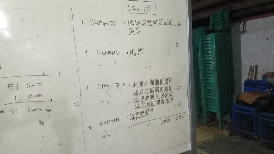 Hingga akhir perhitungan, RT 32 dimenangkan oleh Sukamto dengan 68 suara, Ashari 6 suara dan Sunarto 14 suara. Sementara untuk hasil pemilihan RW 08 dimenangkan oleh Didik Tri Haryanto dengan perolehan 160 suara. Diikuti Sunarto 48 suara, Sukiman 24 suara, dan Sukirman 11 suara.