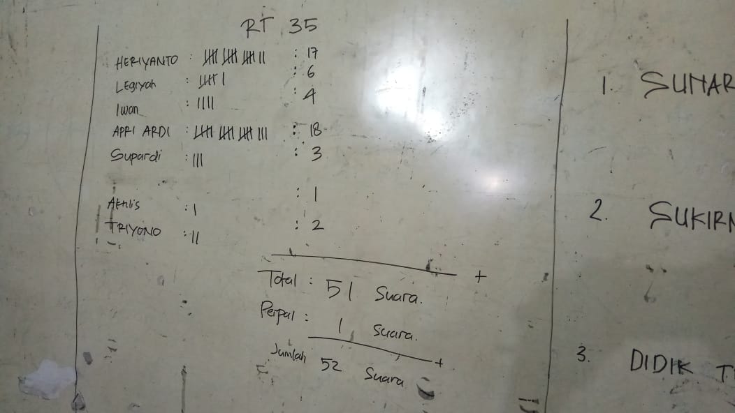 Adapun ketua RT yang dipilih adalah RT 32 dan RT 35. Sementara RW yang dilakukan pemilihan adalah RW 08. Meskipun dengan system yang agak sedikit berbeda. Pemilihan RT 35 dilaksanakan dengan cara warga yang telah memiliki hak pilih untuk menuliskan nama Ketua RT pilihannya. Sementara RT 32 dengan memilih 3 calon yang sudah ada. Diantaranya adalah Sukamta, Ashari dan Sunarto. Sementara untuk calon 4 Ketua RW 08 adalah Sunarto. Sukirman, Didik Tri Haryanto, dan Sukiman.