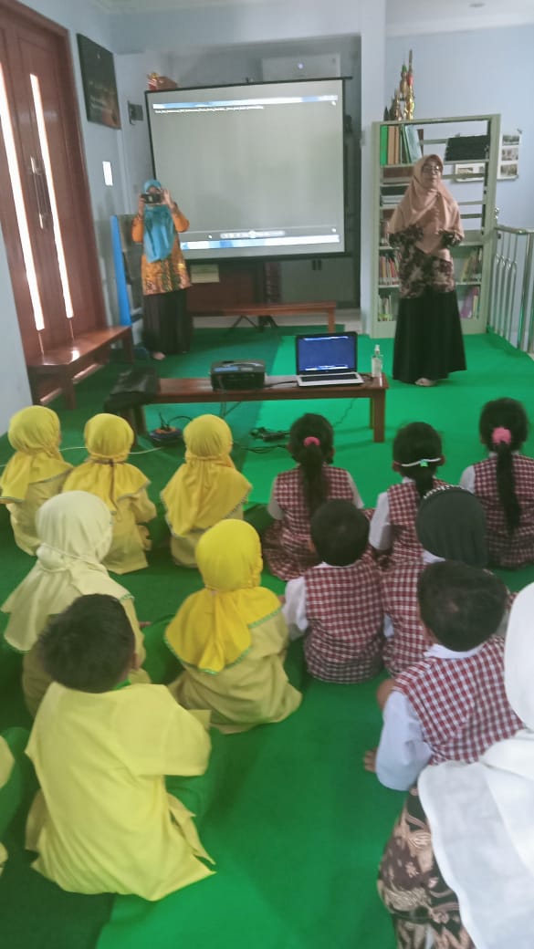 Di perpustakaan, mereka langsung dipandu menuju lantai 2 perpustakaan, dimana ruangan telah disiapkan untuk melaksanakan kegiatan Nobar (Nonton Bareng) Kartun Sejarah Nabi-Nabi. Sebelum acara nobar dimulai, Eny Suprapti, S.Pd. selaku Kepala TK Bhakti Pertiwi terlebih dahulu memberikan arahan tentang tata tertib berada di ruang perpustakaan. Ketika film mulai diputar, anak-anak nampak menyimak dengan khidmat. Setelah pemutaran film selesai, para siswa juga diajak untuk membaca buku-buku anak milik perpustakaan.