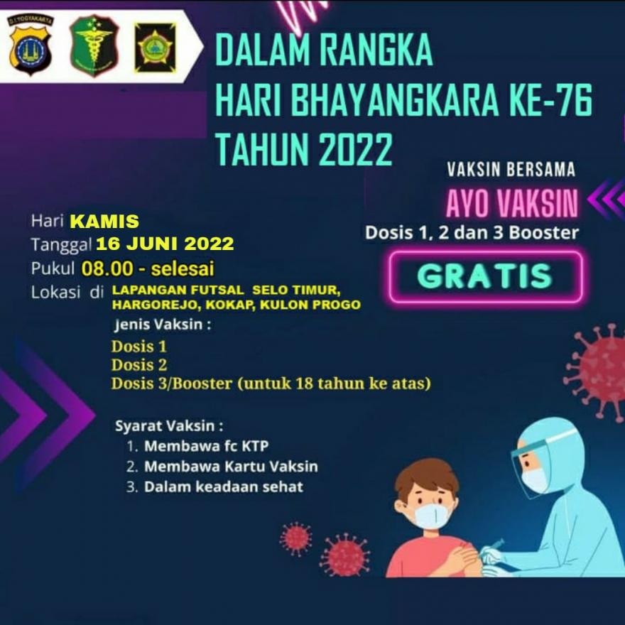 Hargorejo. Dalam rangka hari Bhayangkara ke-76 Tahun 2022 yang jatuh pada 1 Juli 2022 mendatang, Polres Kulon Progo bekerja sama dengan Puskesmas Kokap 1 akan mengadakan kegiatan vaksinasi covid-19.