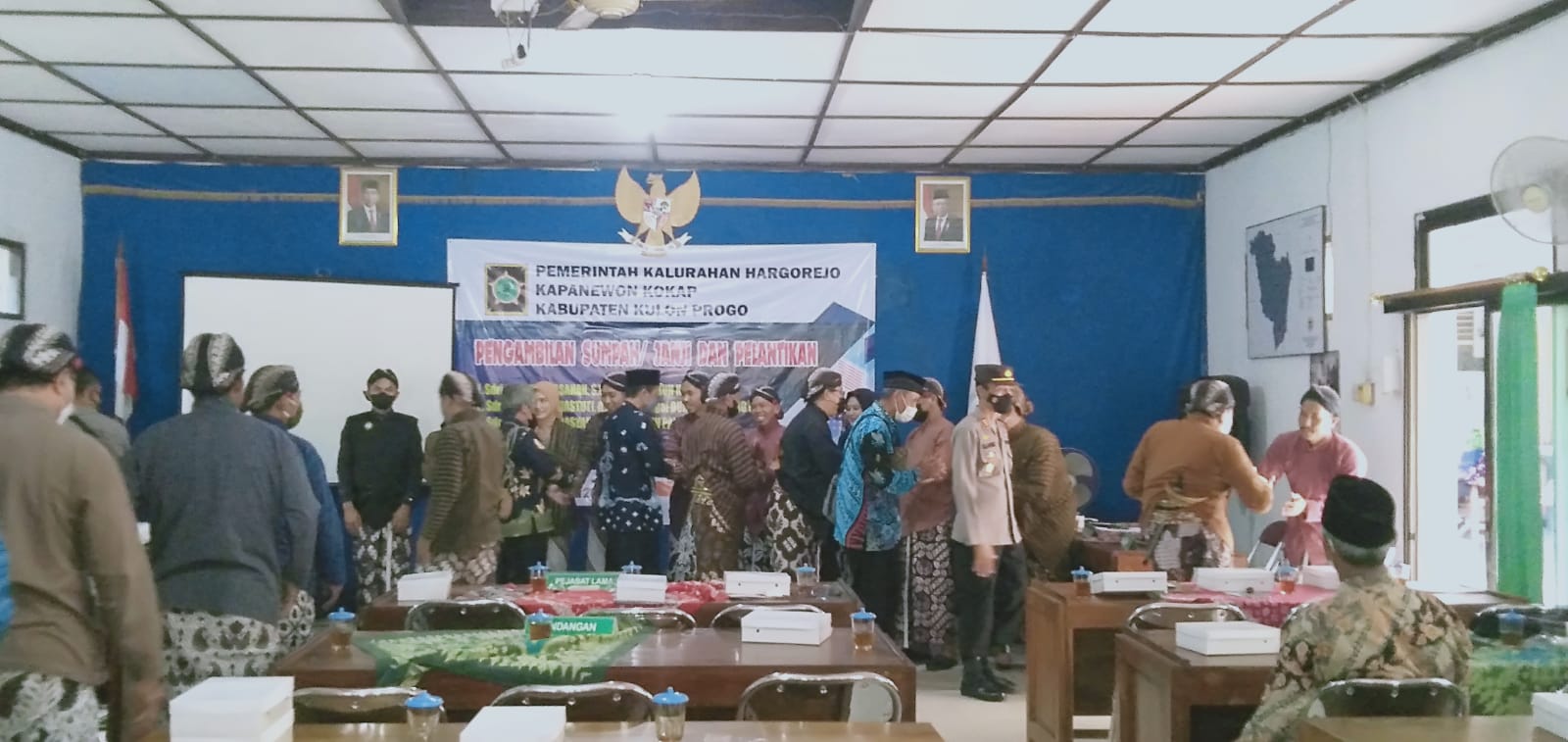 Hargorejo. Karena bertepatan dengan hari Kamis Pahing, acara pengambilan sumpah/janji dan pelantikan Pamong Kalurahan Hargorejo dibalut dengan nuansa budaya jawa. Acara yang dilaksanakan pada hari Kamis (30/06/2022) di Aula Kalurahan Hargorejo ini dihadiri oleh Dinas PMD Dalduk dan KB Bapak Risdiyanto, Danramil yang diwakili Serma Sugiyantoro selaku Babinsa, Kapolsek Kokap AKP Sujarwo, dari Polsek Kokap Bapak Agus Marwoto, Bhabinkamtibmas Hargorejo Bripka Sunarto, S.E, KUA Kokap Drs Suyatno, Panewu Kokap Bapak Yulianta Nugraha, S.Ip, M.Si, Achmat Zainuri dari Kapanewon Kokap, Ketua BPK dan anggota, Ketua TP PKK Hargorejo,Jajaran pegawai BUMkal, Pendamping Desa, Mantan Lurah Hargorejo, tokoh agama dan tokoh masyarakat, serta tamu undangan dari keluarga dukuh baru.