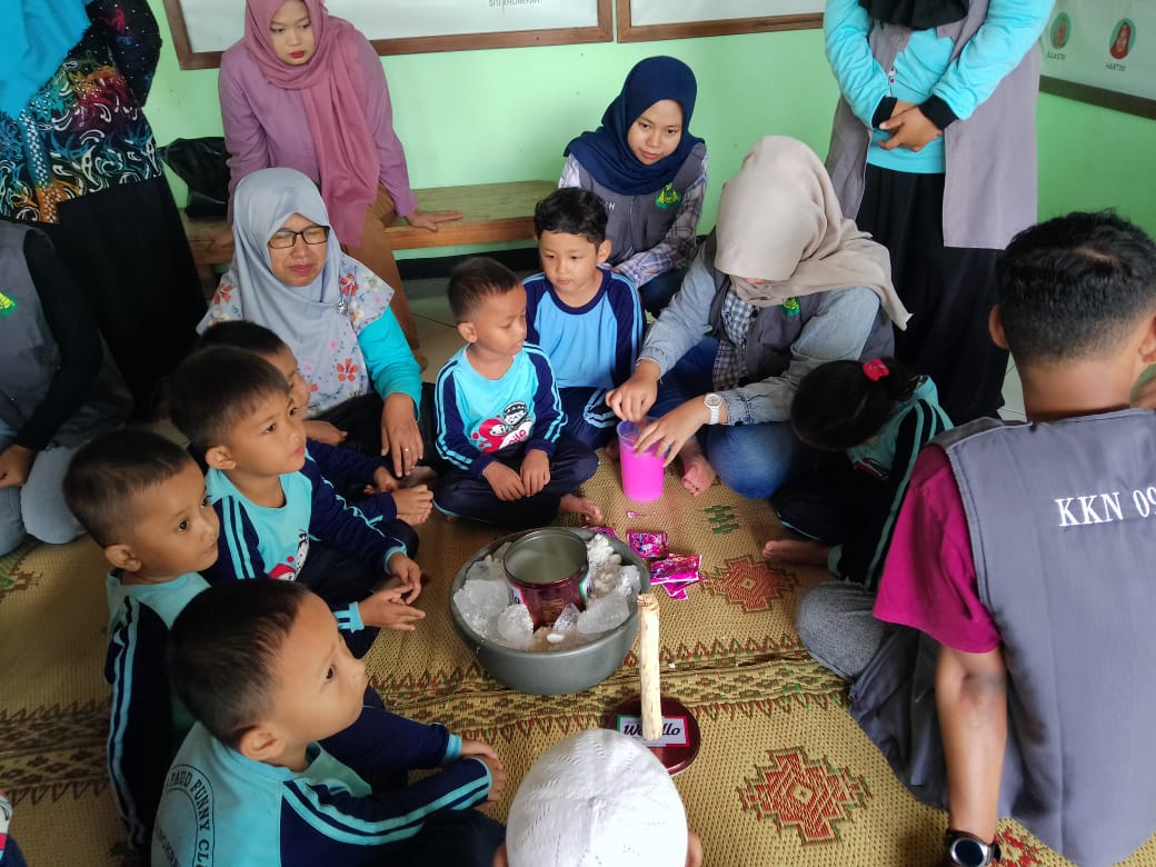 Uniknya pada kegiatan paud kali ini, para mahasiswa mendemonstrasikan cara pembuatan es puter atau yang lebih dikenal dengan nama es dung-dung atau es tung tung. Alat yang digunakan pun terbilang sederhana, yakni dengan menggunakan baskom besar yang berisi es batu dan garam serta putarannya menggunakan kaleng bekas yang diberi gagang kayu di atasnya. Pada kesempatan ini, peserta didik dibagi menjadi 2 kelompok dan dilibatkan secara langsung dalam proses pembuatan, seperti memutar kaleng serta membantu menyiapkan minuman perisa. Setelah itu, es yang sudah jadi dibagikan kepada peserta didik untuk dinikmati bersama. Selain mengajarkan keterampilan pada anak, kegiatan ini juga mempererat kebersamaan para murid.