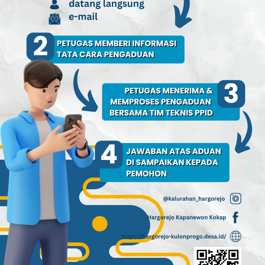 Atau melalui sarana pengaduan yang disediakan di ruang pelayanan. Terhadap pengaduan yang diterima, Pemerintah Kalurahan Hargorejo akan berupaya untuk menjaga informasi pribadi dan memberikan jawaban dan penyelesaian yang sebaik-baiknya.