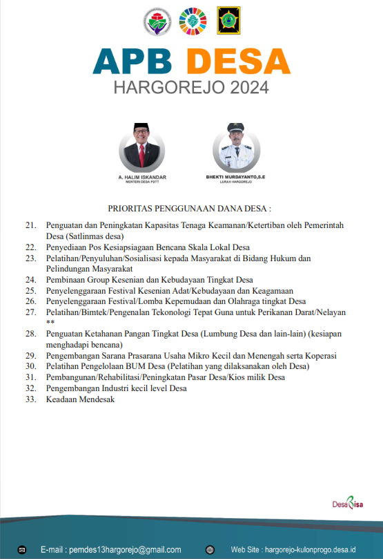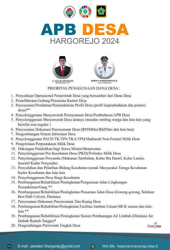 Dalam prioritas penggunaan Dana Desa, Kementerian Desa Pembangunan Daerah Tertinggal dan Transmigrasi telah menerbitkan peraturan Nomor 7 Tahun 2023 Tentang Rincian Prioritas Penggunaan Dana Desa. Prioritas dana desa juga diarahkan untuk percepatan pencapaian tujuan SDGs Desa. Prioritas penggunaan Dana Desa Kalurahan Hargorejo di Tahun 2024 antara lain untuk kegiatan sebagai berikut :